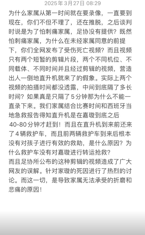 而今日郭嘉璇哥哥发文公开质疑,他表示:我们家属结合比赛时间和西班牙当地急救报告得知直升机是在嘉璇倒地之后40-80分钟才赶到!而且在直升机到来前还来了4辆救护车,而且前两辆救护车到来后根本没有对孩子进行有效的救助,是什么原因?为什么救护车没有对嘉璇进行转运抢救?